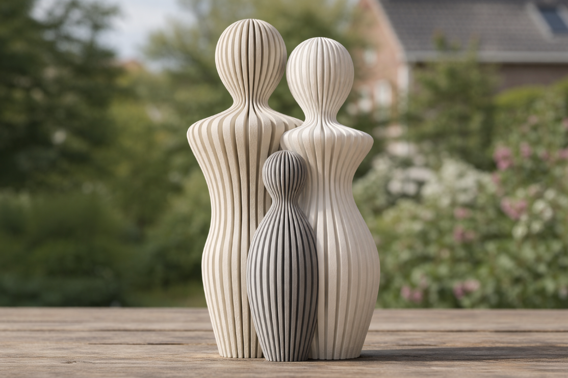 De moderne vormen en diverse kleuren geven elk gezinslid een eigen karakter, terwijl de sculptuur samen verbondenheid en liefde uitstraalt.